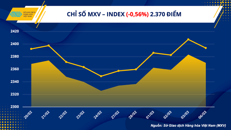 Kết thúc phiên giao dịch đầu tuần ngày 6/3, lực bán chiếm ưu thế trên thị trường hàng hóa đã kéo chỉ số MXV-Index suy yếu trở lại với mức giảm 0,56% xuống 2.370 điểm. Các nhóm nông sản, năng lượng, kim loại đồng loạt ghi nhận nhiều mặt hàng giảm giá mạnh, trong khi nhóm nguyên liệu công nghiệp có xu hướng diễn biến phân hóa hơn.
