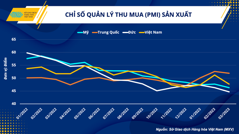 Trong tháng 3, nhiều nền kinh tế lớn chứng kiến sự sụt giảm của chỉ số này, trong đó, Mỹ và Đức thậm chí còn có PMI sản xuất dưới 50 điểm, phản ánh sự thu hẹp của các hoạt động sản xuất. Tại Việt Nam, chỉ số PMI sản xuất cũng giảm từ 51,2 điểm về mức thấp nhất trong vòng ba tháng là 47,7 điểm.