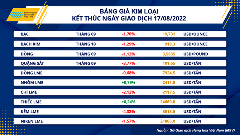 Kết thúc ngày giao dịch 17/8, sắc đỏ cho thấy xu hướng giảm chiếm ưu thế trên bảng giá kim loại. Bạc đánh mất mốc 20 USD/pound với mức giảm 1,76%, dẫn đầu đà giảm trong nhóm kim loại quý. Bạch kim nối dài đà suy yếu sang ngày thứ 3, giảm 1,29% xuống còn 919,3 USD/ounce.