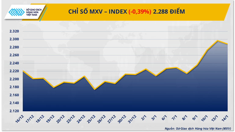 Theo Sở Giao dịch hàng hóa Việt Nam (MXV), ngày giao dịch hôm qua (14/1), lực bán quay lại chiếm ưu thế và cắt đứt chuỗi tăng 3 phiên liên tiếp trước của chỉ số MXV-Index. Đóng cửa, chỉ số giảm 0,39% xuống 2.288 điểm.