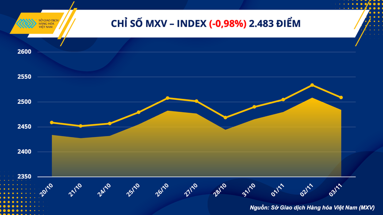 Sắc đỏ bao trùm bảng giá cả 4 nhóm hàng hóa nguyên liệu. Trong đó, thị trường kim loại và nguyên liệu công nghiệp ghi nhận các mức sụt giảm rất mạnh của nhiều mặt hàng quan trọng. Có thể kể đến cà phê Arabica giảm sâu gần 5,5%, bạc lao dốc 5,25%. Tuy nhiên, giá trị giao dịch toàn Sở vẫn tiếp tục tăng 4%, đạt gần 4.900 tỷ đồng.