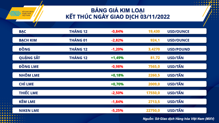 Kết thúc phiên giao dịch ngày 3/11, bảng giá các mặt hàng trong nhóm kim loại tiếp tục chìm trong sắc đỏ, với nguyên nhân chủ yếu do sức mạnh của đồng Dollar Mỹ. Giá bạc giảm 0,84% xuống 19,43 USD/ounce. Bạch kim mất 2,82% giá trị xuống 924,1 USD/ounce.