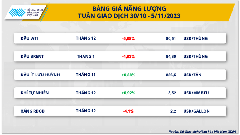 Với 4 trên 5 ngày giảm giá, dầu thô đã kết thúc tuần giao dịch 30/10 – 5/11 trong sắc đỏ, ghi nhận tuần giảm thứ hai liên tiếp. Dầu WTI đánh mất 5,88% giá trị xuống 80,51 USD/thùng, mức thấp nhất trong hai tháng qua. Dầu Brent đánh mất mốc 85 USD/thùng, sau khi giảm 4,83% trong tuần qua.