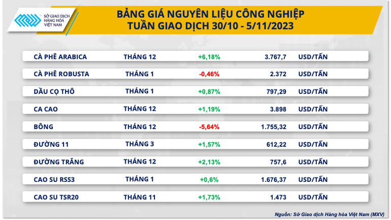 Đóng cửa tuần giao dịch 30/10-5/11, giá bông dẫn đầu đà giảm của nhóm khi đánh mất gần 6% so với tham chiếu. Dữ liệu bán hàng và xuất khẩu bông của Mỹ tích cực đã làm lu mờ lo ngại nhu cầu bông ở mức thấp.