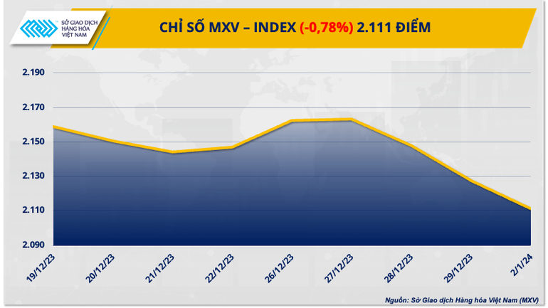 Số liệu từ Sở Giao dịch Hàng hóa Việt Nam (MXV) cho thấy, kết thúc ngày giao dịch đầu năm 2024, lực bán chiếm ưu thế trên thị trường hàng hóa nguyên liệu thế giới. Chỉ số MXV-Index giảm 0,78% xuống 2.111 điểm, nối dài đà giảm sang phiên ngày thứ 3 liên tiếp.