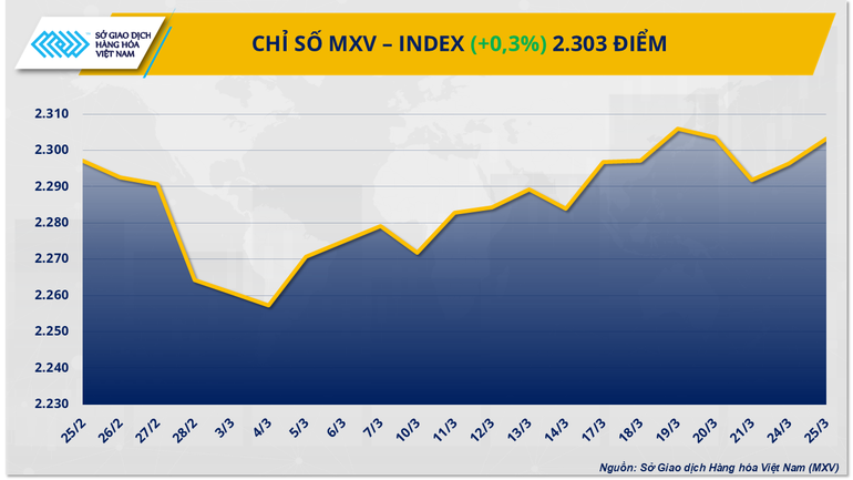 Sở Giao dịch Hàng hóa Việt Nam (MXV) cho biết đóng cửa ngày giao dịch hôm qua (25/3), đà tăng đồng loạt của các mặt hàng nhóm kim loại và nguyên liệu công nghiệp đã tạo lực kéo chỉ số MXV-Index lên mức 2.303 điểm. Đáng chú ý, trong phiên giao dịch hôm qua, giá đồng COMEX đã vượt 11.400 USD/tấn - mức cao nhất mọi thời đại. Trong khi đó, ở chiều ngược lại, bảng giá nông sản vẫn còn chìm trong sắc đỏ…