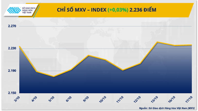 Ở một diễn biến đáng chú ý khác trong ngày giao dịch 17/10, có tới 8 trong tổng số 9 mặt hàng thuộc nhóm nguyên liệu công nghiệp tăng giá. Trong đó, giá hai mặt hàng cà-phê cùng khởi sắc bất chấp dữ liệu xuất khẩu cà-phê tại Brazil có nhiều tín hiệu tích cực trong nửa đầu tháng 10.