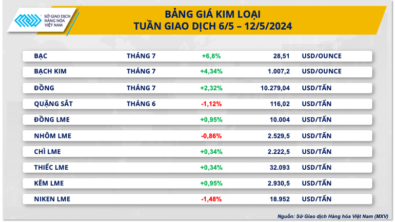 Kết thúc tuần giao dịch 6-10/5, hầu hết các mặt hàng nhóm kim loại đồng loạt tăng giá nhờ hỗ trợ kép từ yếu tố vĩ mô kết hợp với cung-cầu. Đối với kim loại quý, giá bạc và giá bạch kim tăng mạnh sau loạt dữ liệu cho thấy sự suy yếu của nền kinh tế Mỹ, củng cố cho kỳ vọng hạ lãi suất.