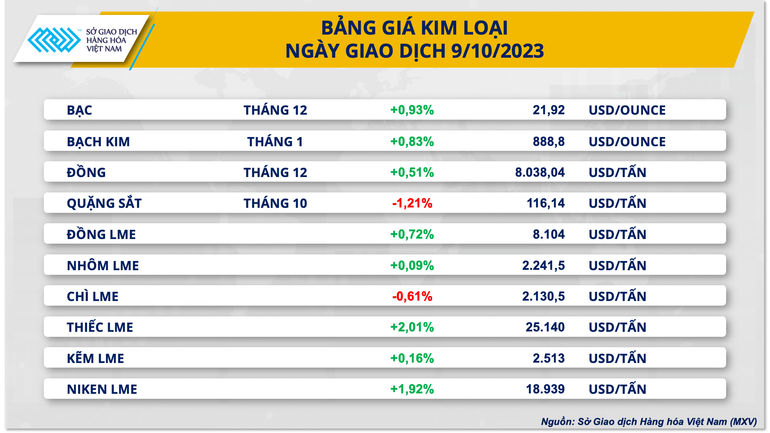 Sắc xanh áp đảo trên bảng giá thị trường kim loại khi ngày giao dịch đầu tuần 9/10 kết thúc. Trong nhóm kim loại quý, cả ba mặt hàng đều tăng giá, nhưng vàng tăng mạnh nhất nhóm khi tăng 1,56% lên 1.860,88 USD/ounce, mức kỷ lục trong vòng hơn một tuần qua. Tương tự, giá bạc và giá bạch kim cũng đã tăng lên mức cao nhất. Cụ thể, giá bạc tăng 0,93% chốt phiên tại mức 21,92 USD/ounce. Giá bạch kim đóng cửa tại 888,8 USD/ounce sau khi tăng 0,83%.