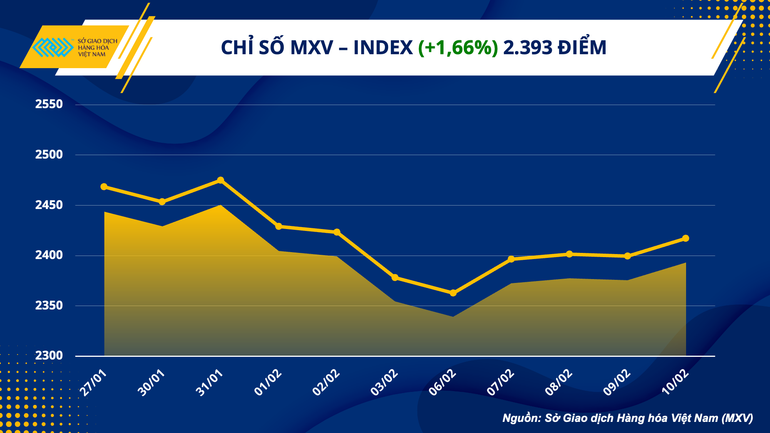 Thông tin từ Sở Giao dịch Hàng hóa Việt Nam (MXV) cho biết, thị trường hàng hóa đóng cửa tuần giao dịch vừa qua (6/2-12/2) với lực mua áp đảo. Đặc biệt, đà tăng rất mạnh của các mặt hàng năng lượng đã hỗ trợ chỉ số MXV-Index tăng 1,66% lên 2.393 điểm. Giá trị giao dịch toàn Sở trung bình đạt 3.000 tỷ đồng mỗi phiên.