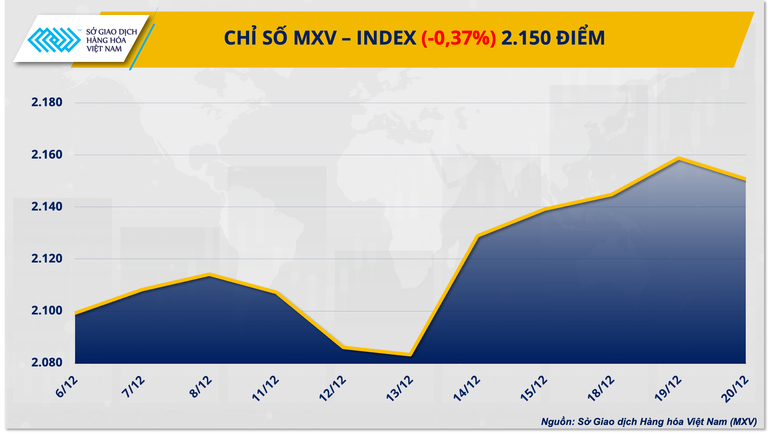 Trong khi giá nhiều mặt hàng nhóm năng lượng và kim loại lại đi lên. Chỉ số MXV-Index rơi 0,37% xuống 2.150 điểm, chấm dứt chuỗi tăng 4 ngày liên tục. Giá trị giao dịch đạt trên 4.200 tỷ đồng.
