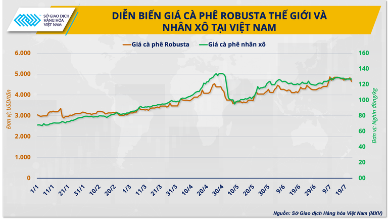 Đứng trước loạt thách thức về nguồn cung, tính đến hết ngày 23/7, giá cà-phê Robusta ghi nhận mức tăng 62% so với thời điểm đầu năm. Đáng chú ý, giá mặt hàng này đã thiết lập mức đỉnh lịch sử vào ngày 12/7 khi leo lên mốc 4.849 USD/tấn. "Đi một bước theo một bước" với thị trường thế giới, giá cà-phê nhân xô tại Việt Nam đã xác lập mức giá cao nhất lịch sử vào ngày 30/4 khi tiến lên 134.400 đồng/kg, tăng khoảng 70% so với đầu năm và gấp hơn hai lần mức giá cùng kỳ năm trước. Tính đến ngày 24/7, giá cà-phê nhân xô tại Tây Nguyên và các tỉnh Nam Bộ ghi nhận trong khoảng 126.000 đồng/kg, là mức cao so cùng kỳ các năm.