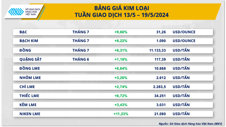 Khép lại tuần giao dịch 13/5-19/5, nhờ lực đỡ từ cả yếu tố vĩ mô và cung-cầu, các mặt hàng kim loại thi nhau thiết lập các mức đỉnh mới. Đối với kim loại quý, giá bạc và giá bạch kim bật tăng mạnh sau loạt dữ liệu kinh tế yếu của Mỹ củng cố cho kỳ vọng hạ lãi suất. Chốt tuần, giá bạc tăng 9,66% lên 31,25 USD/ounce, đánh dấu lần đầu tiên giá bạc vượt qua mốc 31 USD sau 11 năm. Giá bạch kim tăng 8,22%, dừng chân tại 1.090 USD/ounce, mức cao nhất trong một năm.