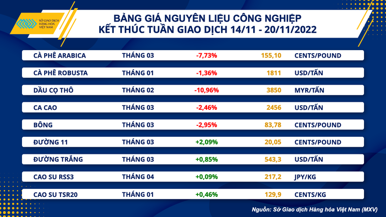 Theo sát diễn biến giá dầu cọ, với việc ghi nhận 5/5 phiên giao dịch cùng mang sắc đỏ, Arabica nối dài đà giảm sang tuần thứ 2 liên tiếp, đẩy giá hiện tại về mức 155,10 cents, thấp nhất trong hơn 18 tháng qua. Nguyên nhân chính khiến giá mặt hàng này lao dốc trong tuần qua phải kể đến việc tồn kho đạt chuẩn trên Sở ICE tăng liên tục sau khi chạm mốc thấp nhất trong 23 năm và đà tăng này dự kiến sẽ còn kéo dài trong thời gian tới khi có gần 600.000 bao đang chờ được phân loại tiếp. Thêm vào đó, số liệu xuất khẩu tích cực trong 2 tuần đầu tháng 11 tại Brazil đang cho thấy việc đẩy mạnh nguồn cung ra thị trường của quốc gia xuất khẩu số 1 thế giới, tạo thêm sức ép lên giá, khiến mặt hàng này giảm sâu trong tuần qua.