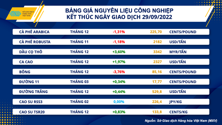 Kết thúc phiên giao dịch 29/9, thị trường nguyên liệu công nghiệp diễn biến trái chiều với 4 mặt hàng giảm và 5 mặt hàng tăng giá. Điểm đáng chú ý nhất thuộc về mức giảm gần 4% của bông, đẩy giá bông về mức 85,16 cents, thấp nhất trong hơn 2 tháng trở lại đây.