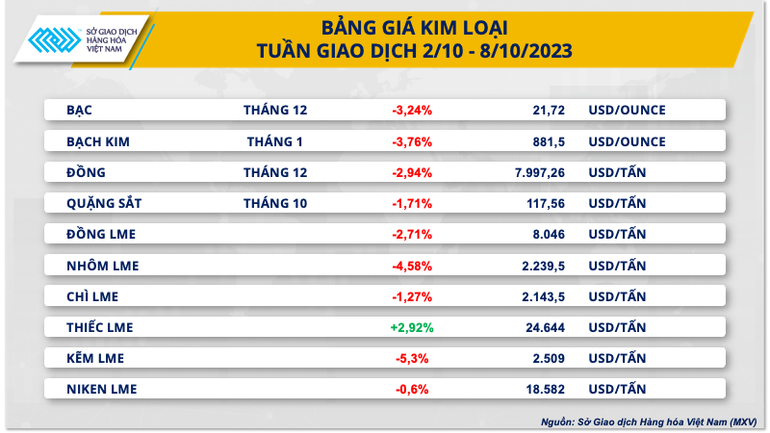 Khép lại tuần giao dịch 2-8/10, ngoại trừ thiếc LME, tất cả các mặt hàng kim loại còn lại đồng loạt đóng cửa trong sắc đỏ. Trong nhóm kim loại quý, cả ba mặt hàng đều duy trì đà giảm sang tuần thứ hai liên tiếp. Cụ thể, giá bạch kim dẫn dắt đà giảm của nhóm khi giảm 3,76% xuống 881,5 USD/ounce, mức thấp nhất trong vòng 11 tháng. Trong khi đó, giá bạc giảm 3,24%, đóng cửa tuần tại mức 21,72 USD/ounce, mức thấp nhất kể từ đầu tháng 3/2023. Giá vàng có mức giảm thấp nhất nhóm khi giảm 0,87% xuống 1.832,26 USD/ounce.