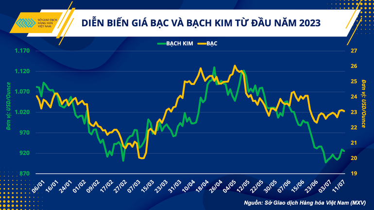 Theo Sở Giao dịch Hàng hóa Việt Nam (MXV), kết thúc phiên giao dịch ngày 11/7, giá bạc niêm yết trên Sở COMEX giảm 0,27% xuống 23,28 USD/ounce. Giá bạch kim trên Sở NYMEX giảm 0,26% xuống 932,4 USD/ounce. Sau đà tăng trong cuối quý I, đầu quý II, trong vòng hơn 2 tháng trở lại đây, giá hai mặt hàng kim loại quý này đang có xu hướng hạ nhiệt nhẹ.