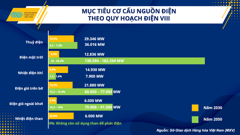Theo Quy hoạch điện VIII, các nguồn năng lượng tái tạo phục vụ sản xuất điện, đạt tỷ lệ khoảng 30,9-39,2% vào năm 2030, hướng tới mục tiêu tỷ trọng năng lượng tái tạo đạt mức 47% phù hợp điều kiện của JETP, và định hướng đến năm 2050, tỷ lệ năng lượng tái tạo lên đến 67,5-71,5%.