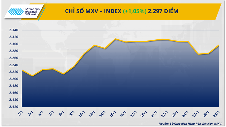 Theo MXV, kết phiên giao dịch ngày hôm qua (29/1), chỉ số MXV-Index tăng 1,05% lên mức 2.297 điểm.