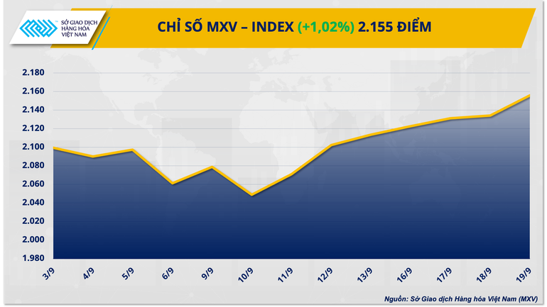 Sở Giao dịch hàng hóa Việt Nam (MXV) cho biết lực mua tiếp tục chiếm ưu thế đã hỗ trợ chỉ số MXV-Index tăng 1,02% lên mức 2.155 điểm, nối dài chuỗi tăng sang phiên thứ 7.