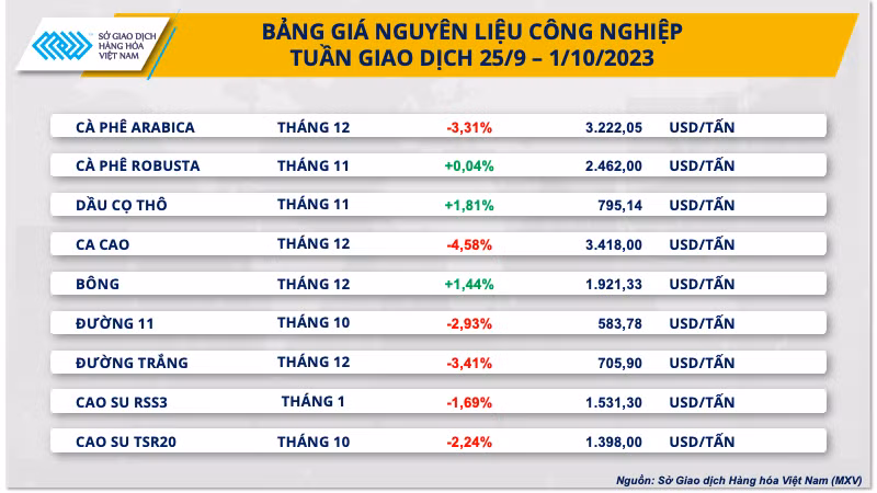 Chốt tuần 25-30/9, trên thị trường nông sản, ngoại trừ mức tăng 0,54% của gạo thô, tất cả các mặt hàng còn lại đều đóng cửa tuần giao dịch 25-30/9 trong sắc đỏ. Cả ba mặt hàng họ đậu đồng loạt giảm giá.