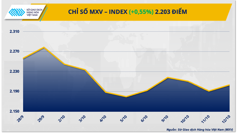 Số liệu từ Sở Giao dịch Hàng hóa Việt Nam (MXV) cho thấy, thị trường hàng hóa nguyên liệu hôm qua (12/10) đóng cửa với diễn biến phân hóa. Lực mua áp đảo trên nhóm nông sản và nguyên liệu công nghiệp. Trong khi đó, sắc đỏ chiếm ưu thế trên bảng giá kim loại và năng lượng.