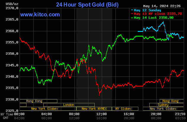 Giá vàng thế giới tăng mạnh trong phiên giao dịch sáng nay. Thời điểm 9 giờ 30 phút ngày 15/5 theo giờ Việt Nam, giá vàng thế giới đứng ở mức 2.356,9 USD/ounce.