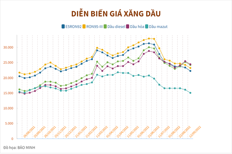 Cụ thể, từ 15 giờ, Liên bộ Công thương-Tài chính thực hiện điều chỉnh giá xăng E5RON92 giảm 1.128 đồng/lít, về còn không quá 22.231 đồng/lít. Xăng RON95-III giảm 1.015 đồng/lít, về không quá 23.215 đồng/lít. Như vậy, giá xăng đã liên tiếp giảm mạnh trong nhiều kỳ điều hành vừa qua.