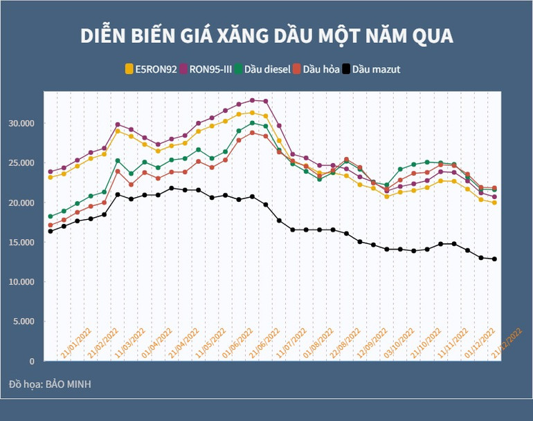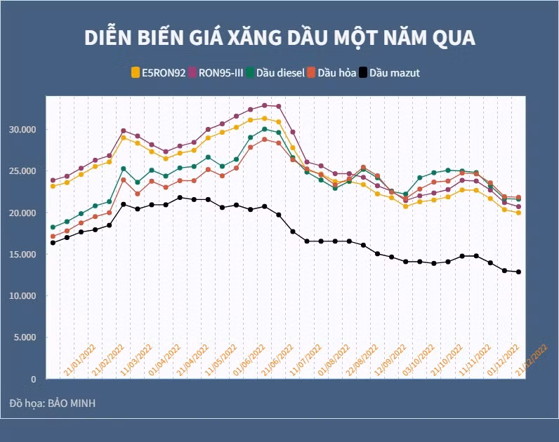Theo Liên Bộ Công thương-Tài chính, mức trích lập Quỹ Bình ổn giá xăng dầu tại kỳ điều hành ngày 21/12 như sau: trích lập 300 đồng/lít đối với xăng E5RON92, 400 đồng/lít đối với xăng RON95, 800 đồng/lít đối với dầu diesel, 500 đồng/lít đối với dầu hỏa và dầu mazut; không chi Quỹ bình ổn giá đối với các mặt hàng xăng dầu.