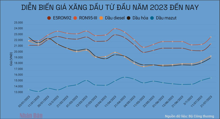 Thị trường xăng dầu thế giới kỳ điều hành lần này (từ ngày 11/7/2023-21/7/2023) chịu ảnh hưởng của các yếu tố như: dự trữ dầu thô của Mỹ giảm, nhập khẩu dầu thô của Trung Quốc tăng mạnh, mức dự trữ của Trung Quốc cũng tăng lên gần mức cao nhất mọi thời đại, kèm theo nhu cầu của Trung Quốc dự kiến sẽ tiếp tục tăng sau đại dịch trong nửa cuối năm nay, dự kiến FED sẽ tăng lãi suất vào tuần tới…, các yếu tố nêu trên khiến giá xăng dầu từ ngày 11/7 đến 21/7 có ngày giảm nhưng nhìn chung là biến động tăng.