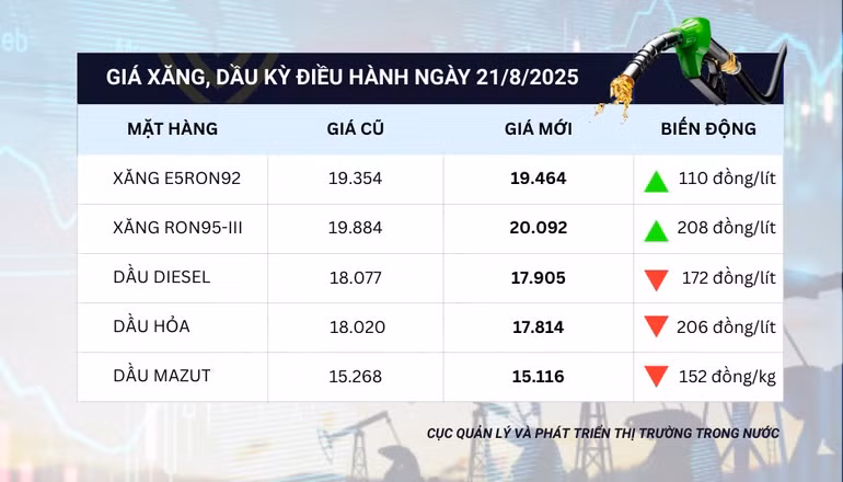 Trước những diễn biến giá thành phẩm xăng dầu thế giới trong thời gian gần đây và thực hiện điều hành giá xăng dầu theo cơ chế thị trường có sự quản lý của Nhà nước, Bộ Công thương và Bộ Tài chính quyết định trong kỳ điều chỉnh ngày 21/8/2025, không thực hiện trích lập và không chi Quỹ Bình ổn giá xăng dầu đối với tất cả các mặt hàng.