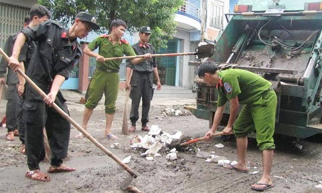 Cán bộ, chiến sĩ Công an Phú Yên thu dọn vệ sinh môi trường đường phố nội thành Tuy Hòa và xã An Lĩnh,