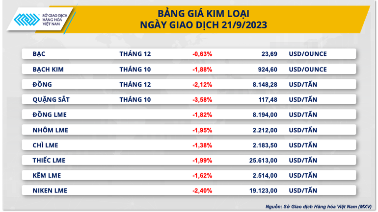 Sắc đỏ phủ kín bảng giá kim loại trong ngày giao dịch 21/9. Trong nhóm kim loại quý, giá bạch kim dẫn dắt đà giảm của nhóm khi giảm 1,88% xuống mức 924,6 USD/ounce. Theo sau là giá bạc với mức giảm 0,63%, đóng cửa tại mức 23,68 USD/ounce. Trong khi đó, giá vàng nối dài đà giảm sang phiên thứ ba liên tiếp khi giảm 0,52% xuống 1.919,57 USD/ounce.