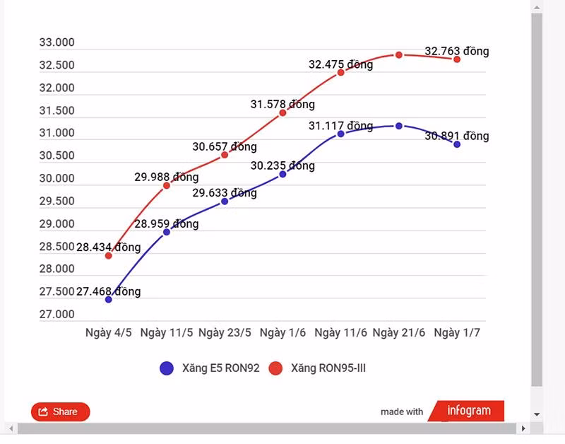 - Biến động giá xăng trong nước thời gian gần đây: