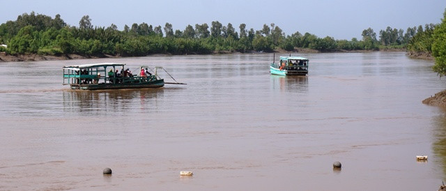 Chiếc phà hoán cải (bên trái) của ông Nguyễn Văn Út không bảo đảm an toàn nhưng vẫn đưa rước khách qua sông.