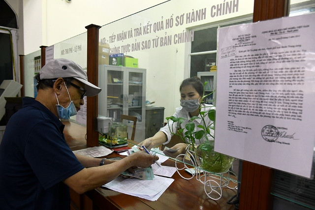 Cán bộ phường Nhật Tân chi trả tiền hỗ trợ cho người dân.