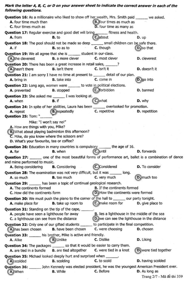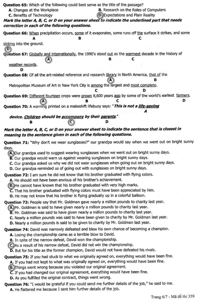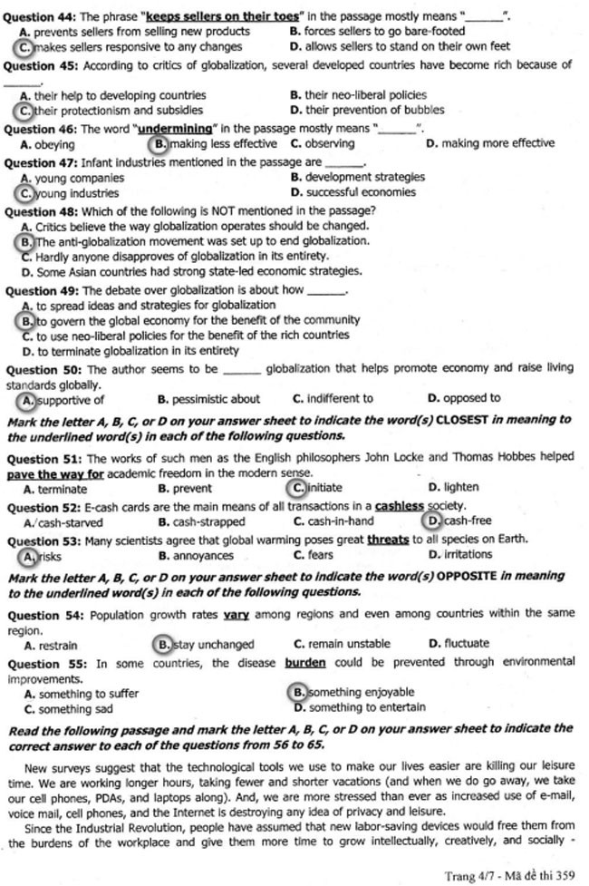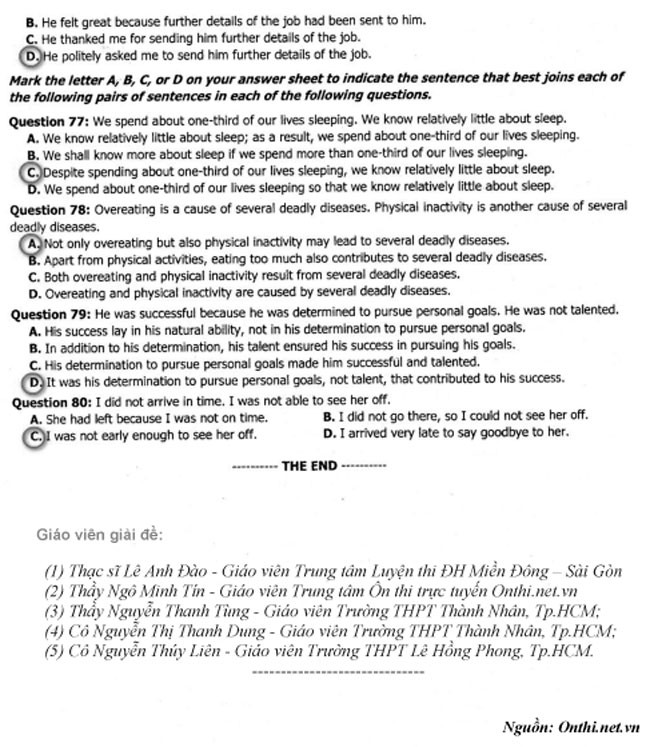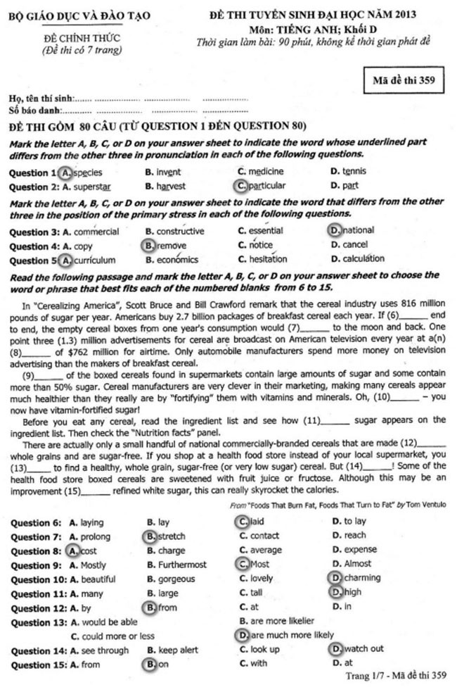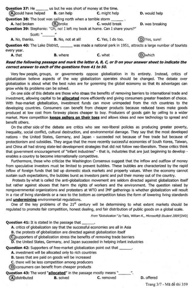 NDĐT – Chiều nay, 9-7, các thí sinh đã làm bài thi môn thứ hai của thi tuyển sinh ĐH, CĐ đợt 2. Sau đây, NDĐT xin giới thiệu gợi ý giải đề thi môn tiếng Anh khối D do các thầy cô giáo thuộc Trung tâm ôn thi trực tuyến onthi.net.vn thực hiện.