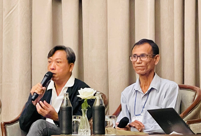 Bác sĩ Nguyễn Tấn Thủ (bên trái) và anh Nguyễn Anh Phong (bên phải) chia sẻ tại hội thảo.