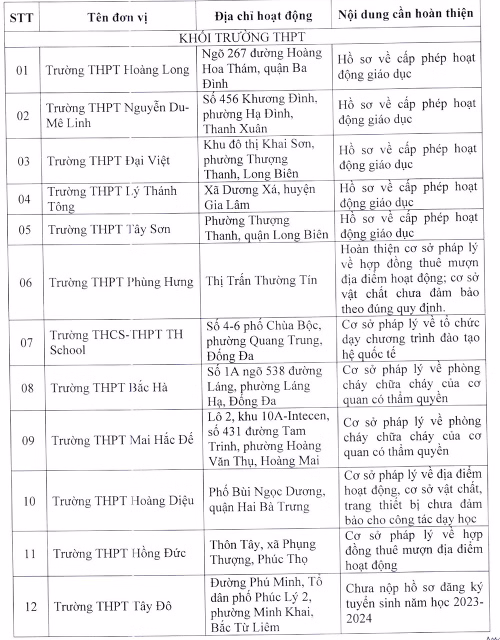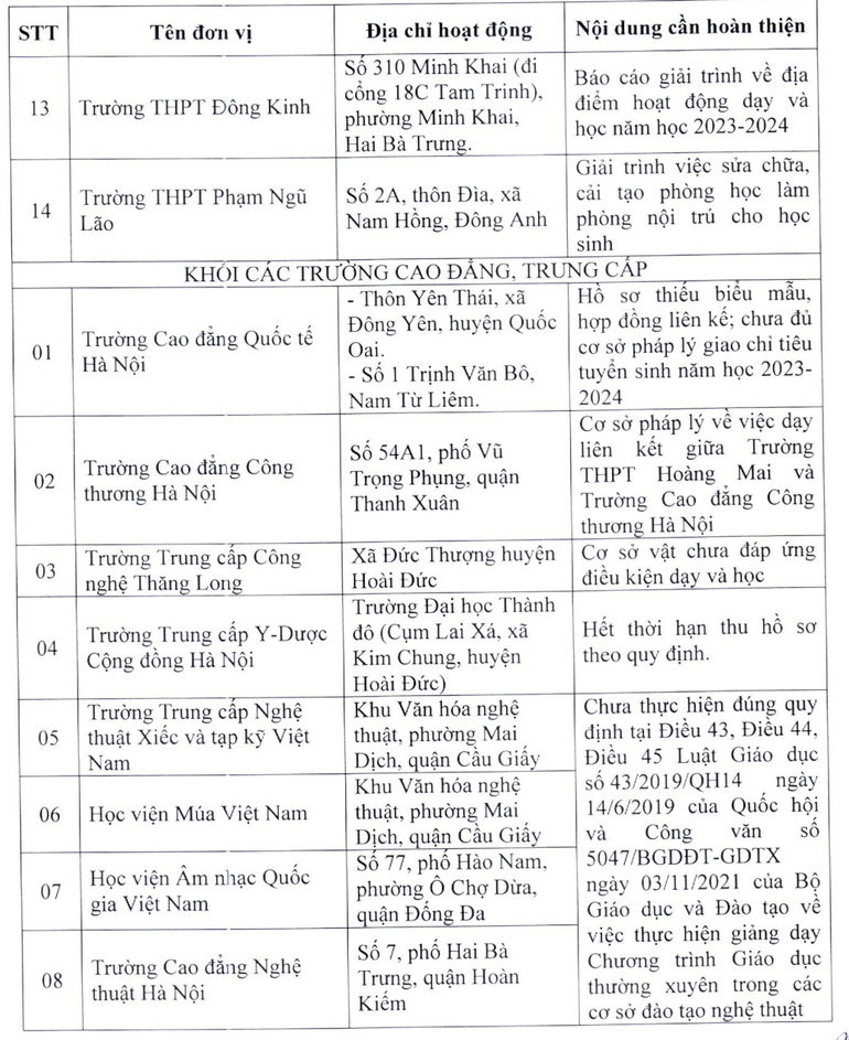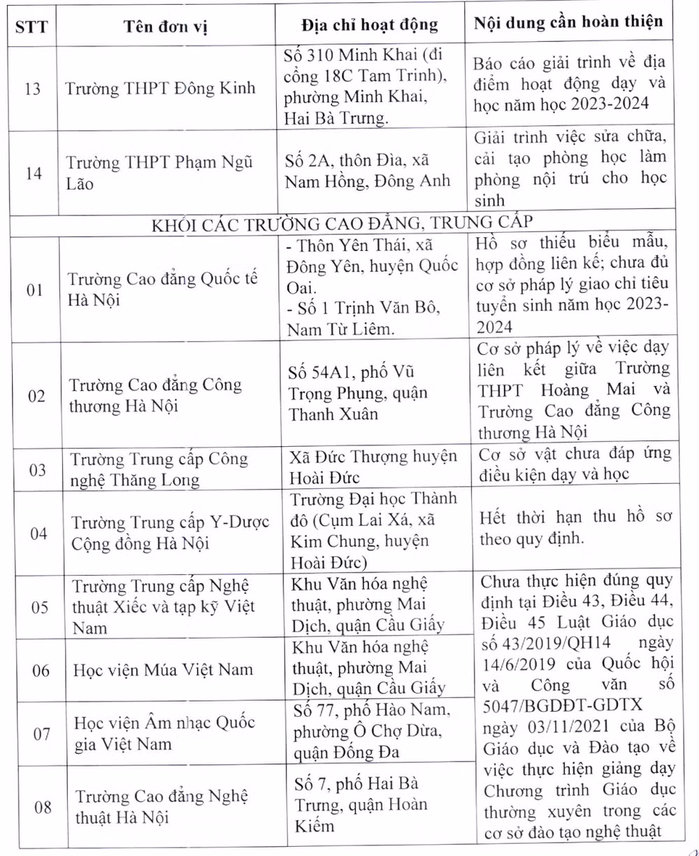 Tại thông báo, Sở Giáo dục và Đào tạo Hà Nội nêu danh sách 22 cơ sở giáo dục chưa đủ điều kiện tuyển sinh lớp 10 năm học 2023-2024, trong đó có 14 trường THPT, trường phổ thông có nhiều cấp học và 8 trường trung cấp, cao đẳng, học viện.