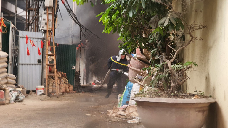 Khu vực bị cháy là dãy nhà tôn dùng để kinh doanh phế liệu và vật liệu xây dựng gần ngõ 2 Đại lộ Thăng Long. Lửa bốc lên cao, bao trùm cả dãy nhà.