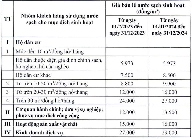 Theo quyết định này, giá bán lẻ nước sạch từ ngày 1/7/2023 đến ngày 31/12/2023 đối với hộ dân thuộc diện gia đình chính sách, hộ nghèo, hộ cận nghèo là 5.973 đồng/m3; hộ dân cư khác là 7.500 đồng/m3; cơ quan hành chính, đơn vị sự nghiệp; phục vụ mục đích công cộng là 12.000 đồng/m3; hoạt động sản xuất vật chất là 15.000 đồng/m3; Kinh doanh dịch vụ là 27.000 đồng/m3.