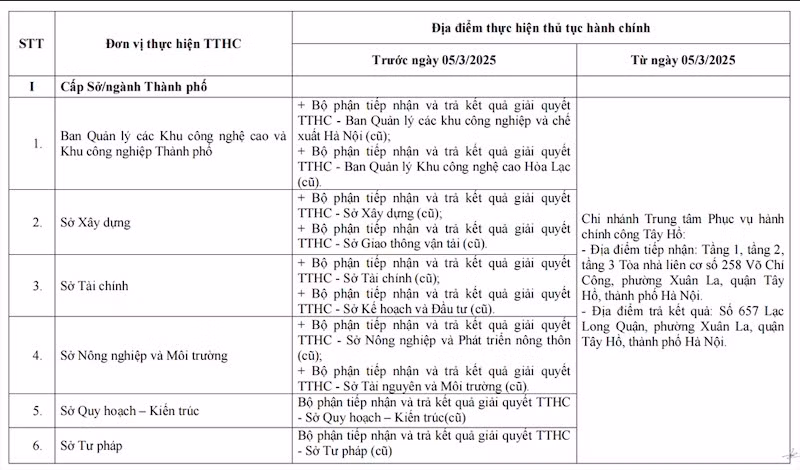 Trung tâm Phục vụ hành chính công thành phố Hà Nội điều chỉnh địa điểm thực hiện thủ tục hành chính tại Bộ phận tiếp nhận và trả kết quả giải quyết thủ tục hành chính của các Sở, ngành thành phố; Ủy ban nhân dân quận Tây Hồ, UBND phường Xuân La (quận Tây Hồ), Ủy ban nhân dân phường Phú Thượng (quận Tây Hồ); Ủy ban nhân dân quận Cầu Giấy, Ủy ban nhân dân phường Dịch Vọng Hậu (quận Cầu Giấy); chi nhánh Văn phòng Đăng ký đất đai Hà Nội quận Tây Hồ, chi nhánh Văn phòng Đăng ký đất đai Hà Nội quận Cầu Giấy.