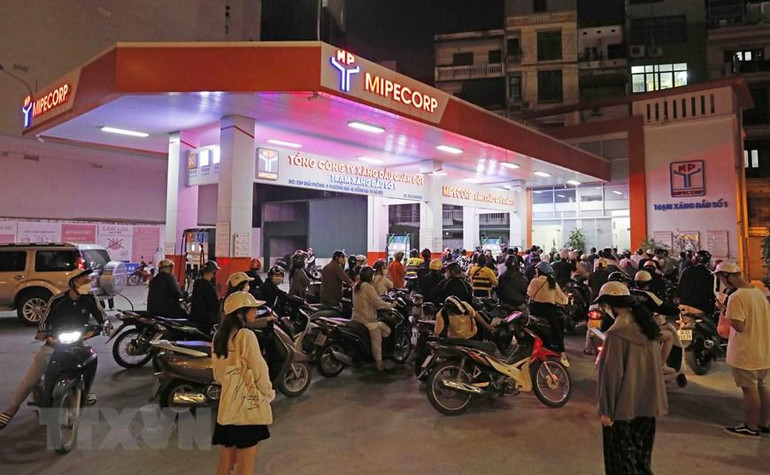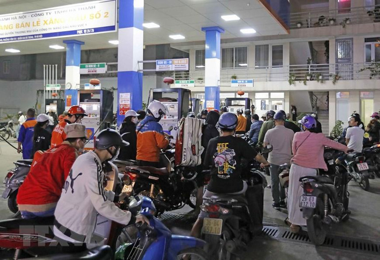 Người dân xếp hàng dài chờ mua xăng, dầu tại cửa hàng kinh doanh xăng, dầu trên đường Giải Phóng, tối 5/11. (Ảnh: Trần Việt/TTXVN)