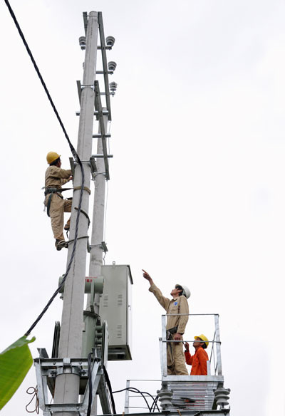 Căn chỉnh máy biến áp trước giờ đóng điện cho các xã đảo.