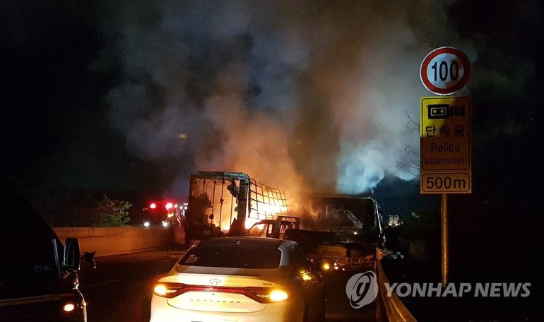 Lửa bao phủ một số phương tiện sau vụ va chạm trong đêm (Ảnh: YONHAP)