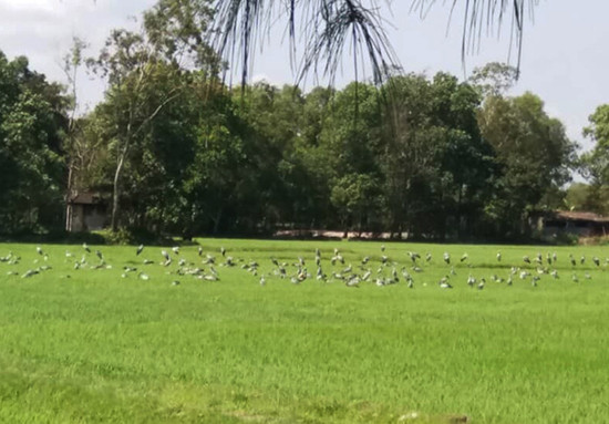 Hình ảnh chim lạ bay vòng ngoạn mục trên bầu trời trước khi sà xuống đồng lúa khiến người dân địa phương không khỏi phấn khích. Trước đó, chiều 12-2, bầy chim lạ đã bay về đồng làng Nhĩ Thượng song ít hơn, chỉ gần trăm con. Sau khi kiếm ăn trong không gian thanh bình làng quê thì số chim này bay đi và đến trưa hôm nay đàn chim đông đến hàng nghìn con bay về, chúng không phá lúa, chỉ tìm kiếm thức ăn giữa ruộng nước.