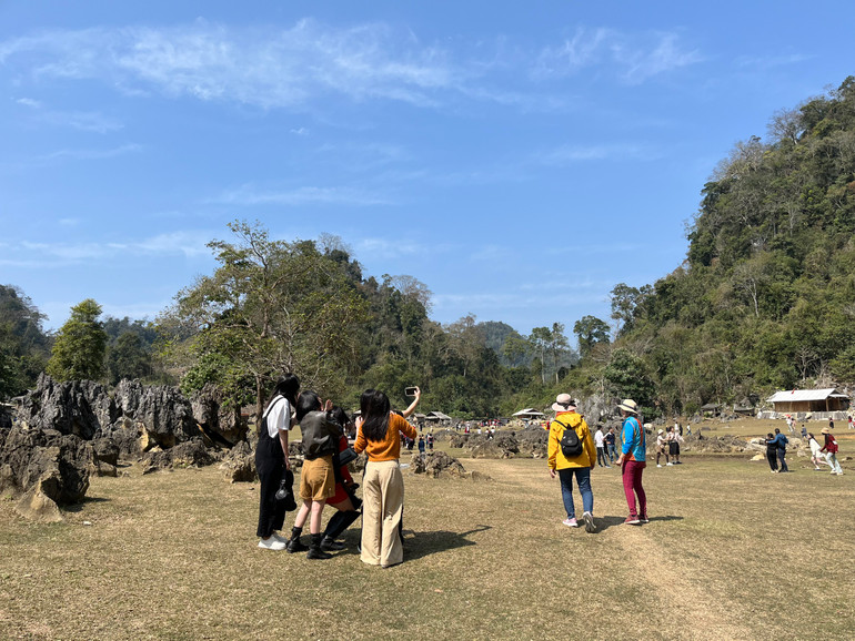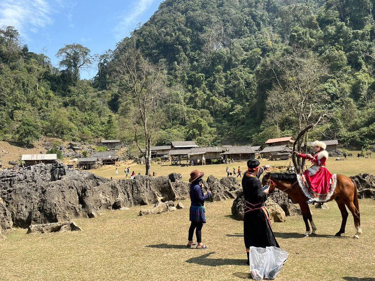 Mấy chục nóc nhà lặng lẽ bên sườn núi, bao quanh thung lũng rộng hơn 1ha. Những em nhỏ dân tộc Mông áo váy sặc sỡ, hai má hây đỏ, hồn nhiên nô đùa trên bãi cỏ dưới cái nắng hanh hao nhưng không e ngại khi du khách ân cần thăm hỏi. Lợn, gà, dê, bò thủng thẳng quanh những phiến đá nhấp nhô. Gặp khi thời tiết ưu ái, du khách tha hồ chiêm ngưỡng và ghi lại những khung hình tuyệt đẹp bởi cảnh quan tựa những thước phim với không gian đất trời hòa quyện.