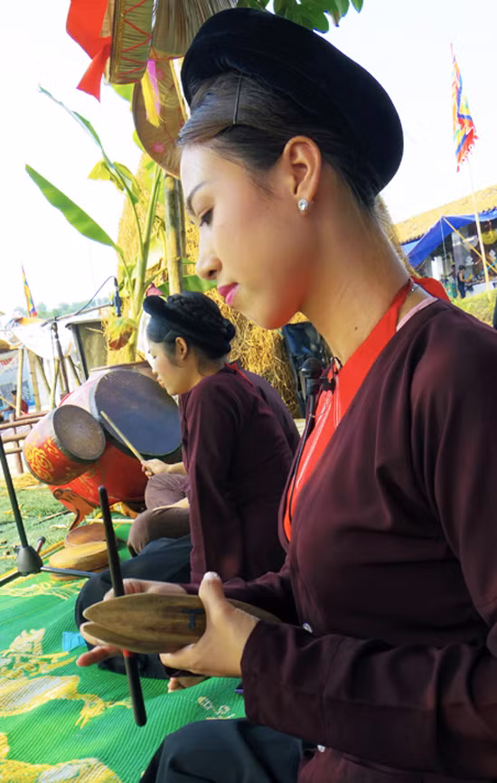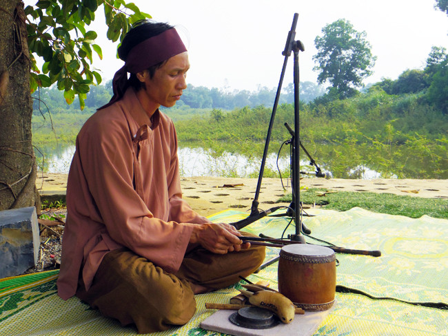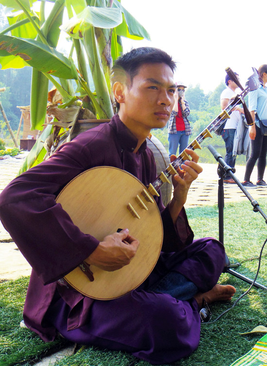 Trong hát Xẩm, nhạc cụ đóng vai trò quan trọng. Trong ảnh: Nhạc công với cây đàn Nguyệt