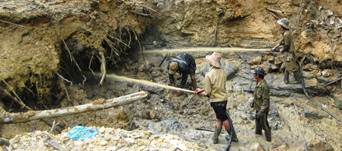Chỉ một bác bảo vệ, vài chú chó tiếp khách, đó là “mô hình” thường thấy khi bước chân vào các điểm khai thác mỏ len lỏi trên những vạt rừng Hà Giang. Khu vực khai thác mấy héc-ta của Công ty Tường Phong đang trong cảnh đất đá lởm chởm, cả một vạt rừng rộng lớn đã bị cày xới vẫn còn hiện nguyên nỗi xót xa. Lý giải điều này, bác bảo vệ của Công ty Tường Phong đóng trên địa bàn bản Xám, xã Ngọc Minh (huyện Vị Xuyên) cho biết: “Công ty từng có thời gian làm ăn phát đạt, có cả trăm công nhân, nhưng bây giờ thì…”.