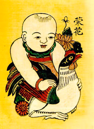 Tranh "Vinh hoa" của làng tranh Ðông Hồ là hình tượng một bé trai bụ bẫm ôm gà trống. Gà trống, gà mái, gà con quây quần trong tranh ấm cúng, đoàn tụ và sung túc, như ước nguyện bình dị của người Việt Nam... "Gà đàn" mà con gà mái mẹ ngậm mồi gọi con trông cũng thật đáng yêu. Tết, nhìn tranh gà thấy thú vui sum họp, thân thương.